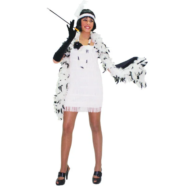 Costume da Charleston disponibile in BIANCO (come da foto) o NERO (tutto uguale cambia solo il colore del vestito). Costume integro come da descrizione. Super sconto per rimanenze di magazzino.