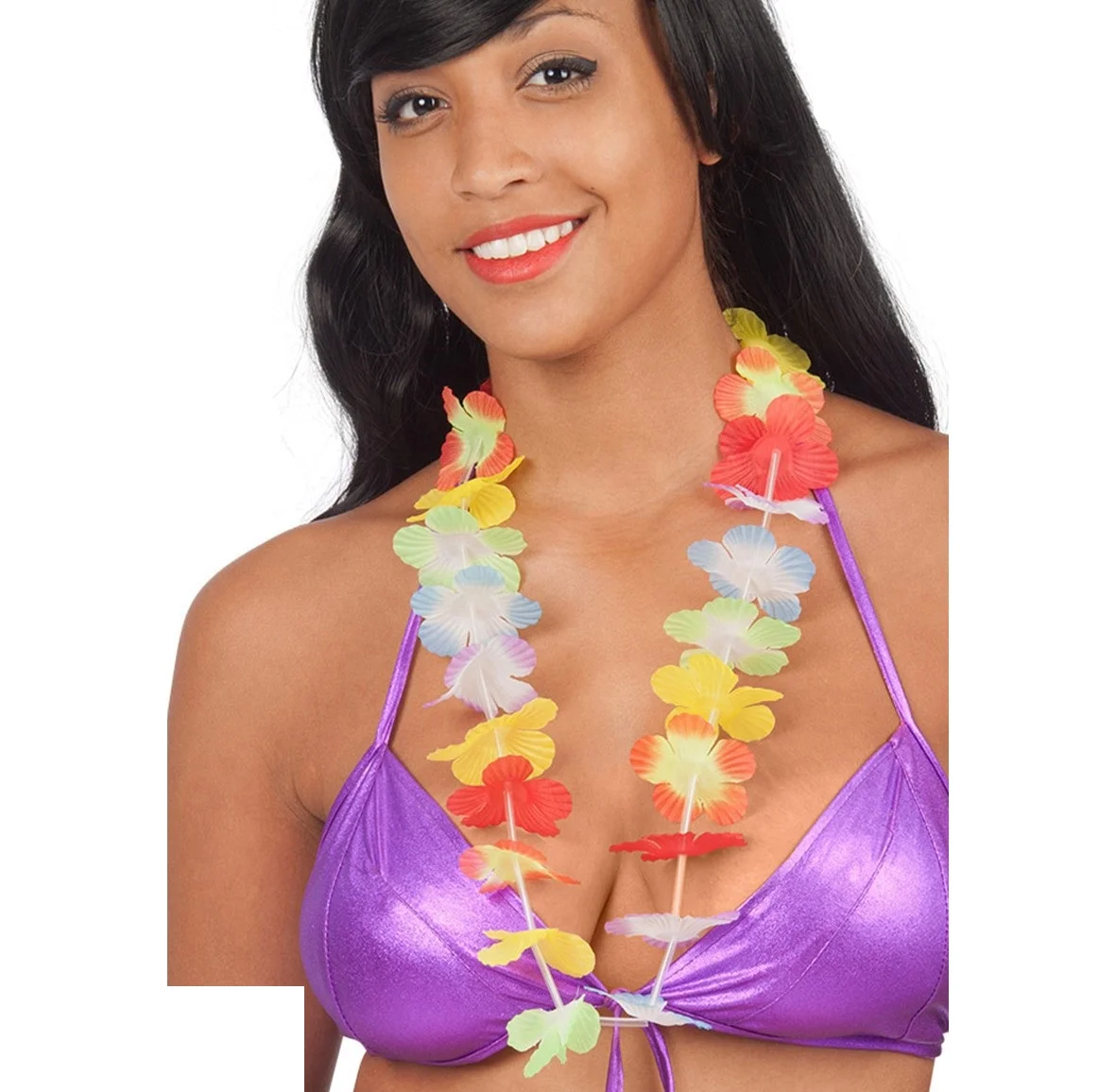 Collana hawaiana con fiori in stoffa colorata. Un accessorio adatto ad ogni festa o serata d’estate al mare, per cenare e stare in allegria con gli amici.