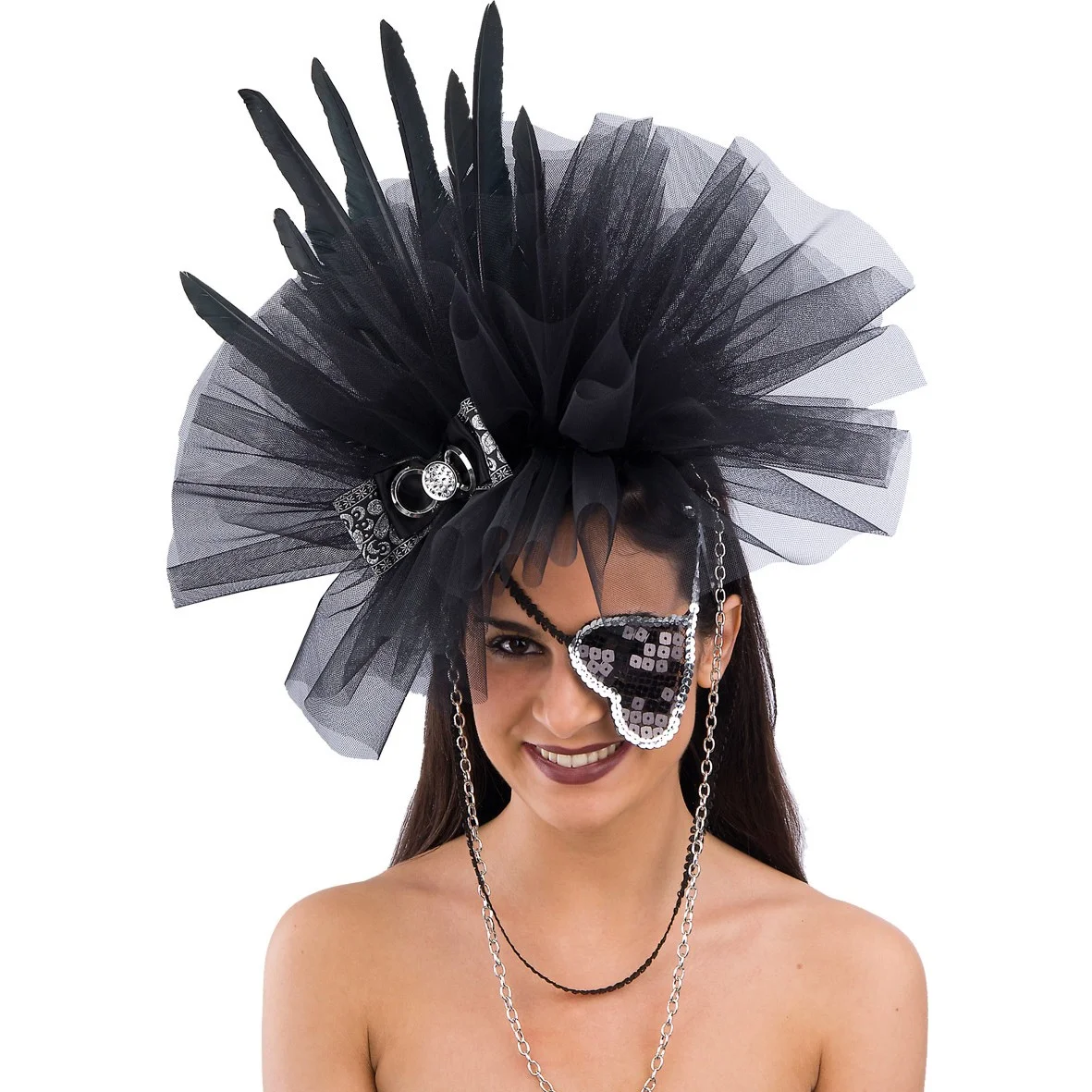 Copricapo ricco di tulle, decorato con piume, fiocco, catenelle, tutto rigorosamente in colore nero con rifiniture argentate. Facile da indossare grazie al cerchietto. Il travestimento sarà completo con la benda a forma di cuore in paillette compresa nella confezione.