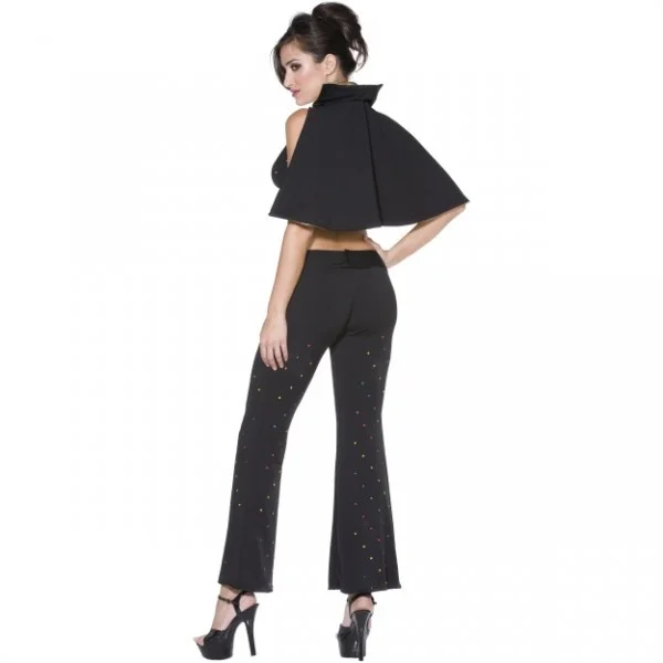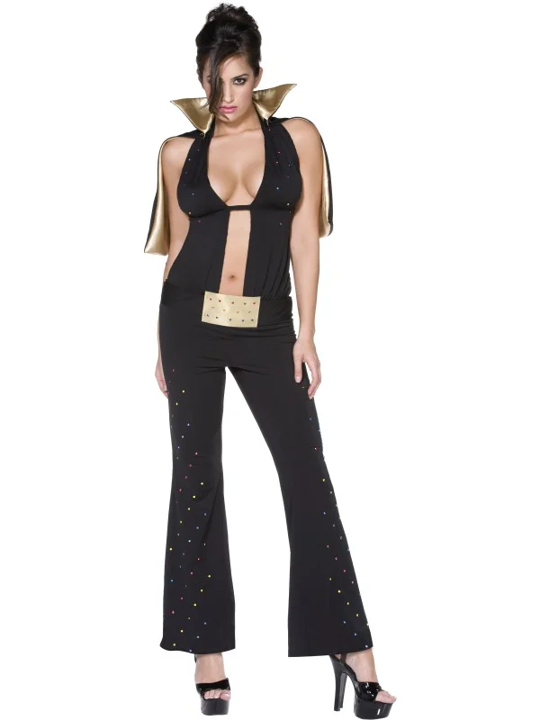 Travestimento in stile Elvis Presley TM è in licenza ufficiale e si compone di una tuta nera con pantaloni, una mantellina dorata e nera con un bel collo semirigido sempre in nero ed oro ed una cintura con fibbia dorata. Sull’abito, come sulla fibbia della cintura, sono presenti diversi lustrini colorati per un effetto davvero luccicante! Questo vestito farà di voi la donna più sexy del rock ‘N roll moderno e lascerete tutti a bocca aperta durante il prossimo Carnevale o per una festa in maschera tra amici!