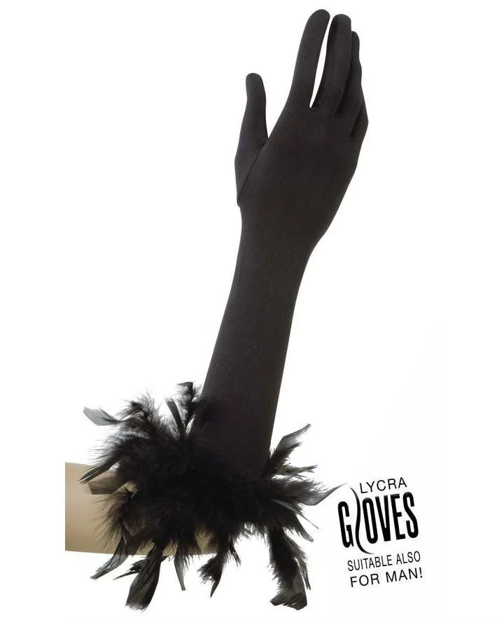 Guanti neri elastici con piume adatti anche per uomo. Lunghezza circa 37 cm.