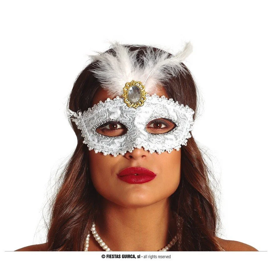 Bellissima maschera in plastica rigida rivestita di pizzo e paillette di colore argento. A completare il tutto un diadema gioiello e piume bianche.