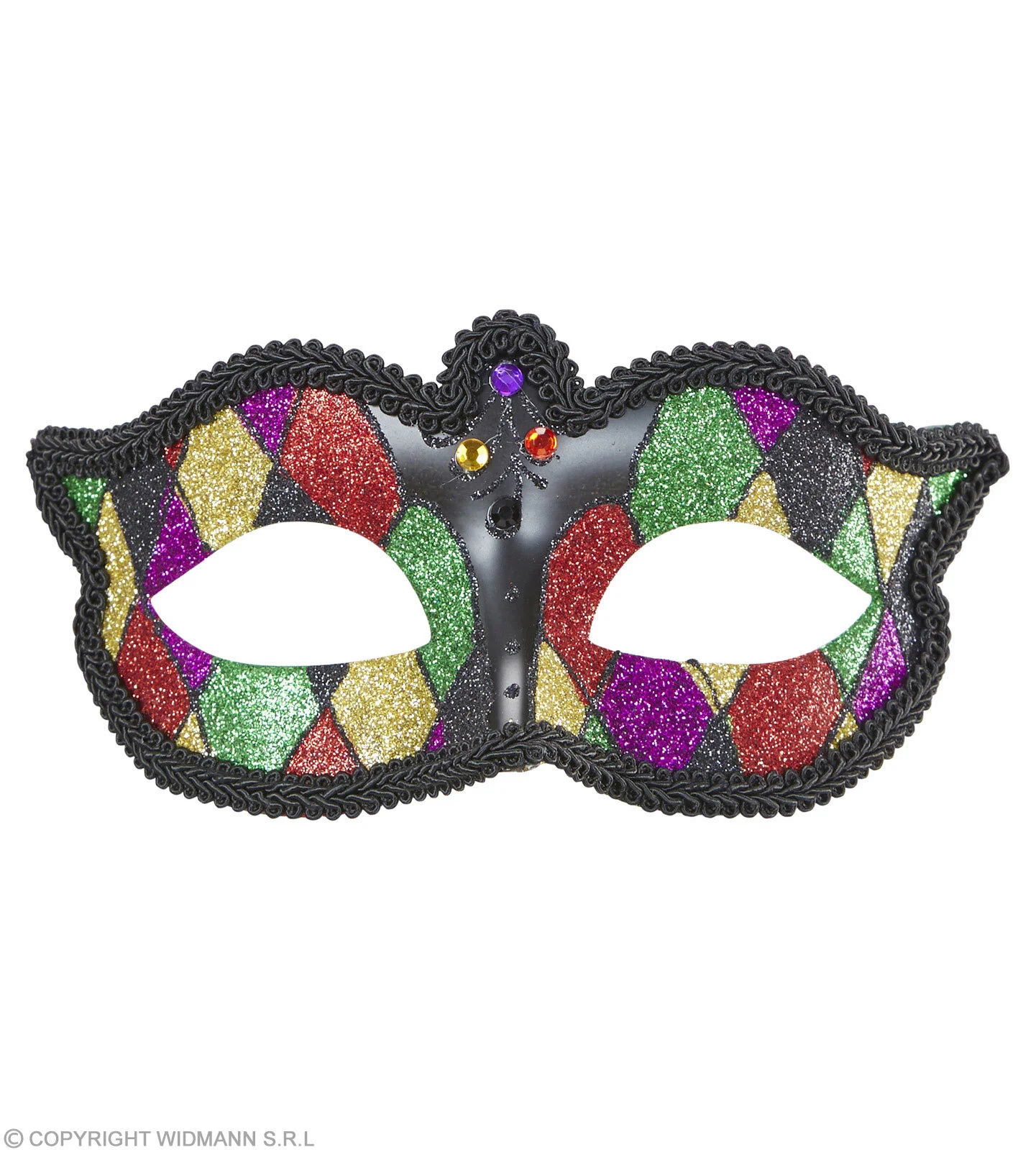 Maschera in plastica rigida con nastrino in raso per la legatura. Ricoperta di glitter in stile arlecchino e rifinita con nastrino lavorato di colore nero. Indicata per il Carnevale di Venezia o per un travestimento estremamente elegante.