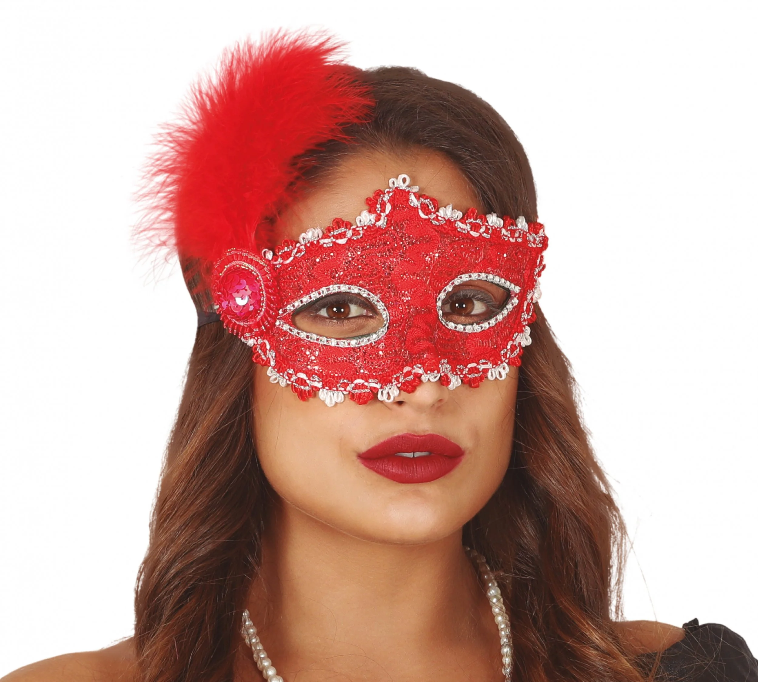 Maschera in plastica rigida rivestita con pizzo e paillette di colore rosso. Al lato della maschera si trova un bottone di paillette rosse e una piuma rossa. Perfetta per un travestimento elegante.