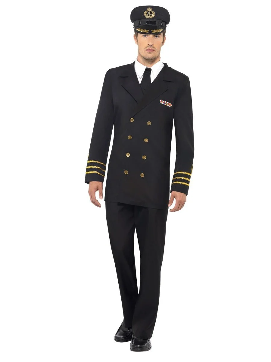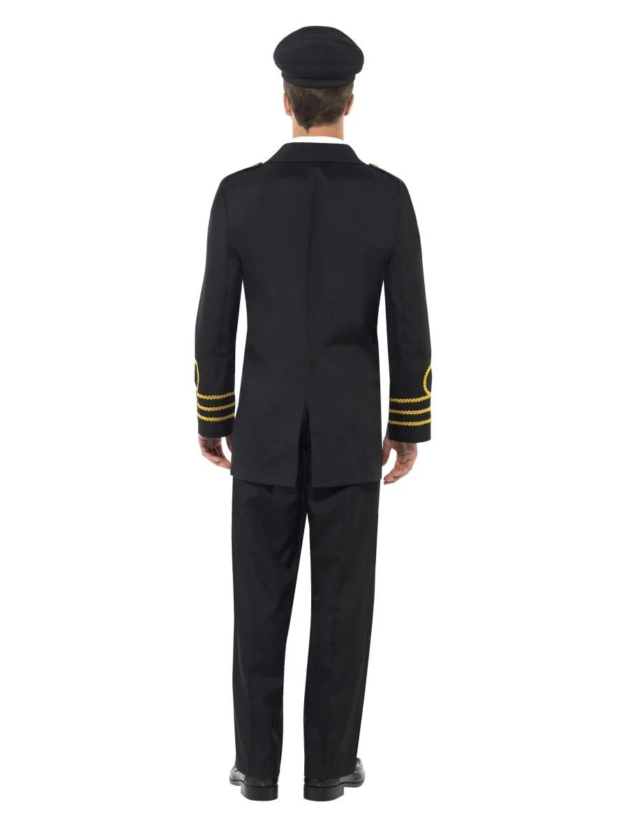 Costume da Ufficiale della marina per uomo con giacca lunga con 4 bottoni dorati e delle fasce dorate sulle maniche. La finta cravatta si attacca alla camicia bianca ed il cappello riprende quello di un vero ufficiale della marina. Un costume perfetto per carnevale, per una festa in maschera o per un evento a tema.