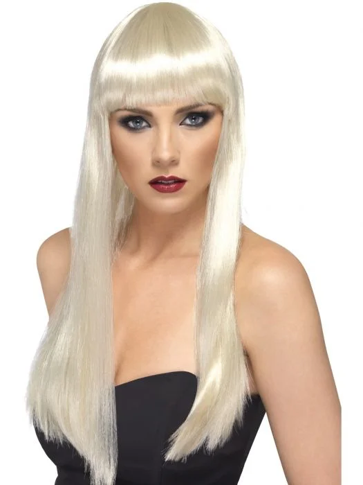 Completa il tuo costume in vero stile Lady Gaga con questa parrucca bionda lunga con frangetta.