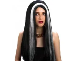 Parrucca nera con bande bianche sul davanti, perfetta per impersonare Morticia Addams o una perfida Strega.