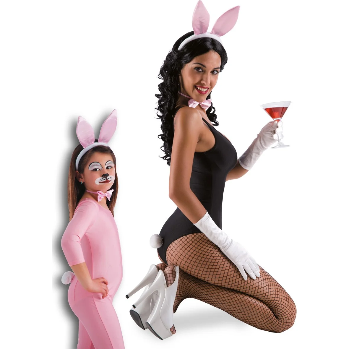 Set da coniglietta in tessuto con cerchietto con lunghe orecchie rosa e bianche, papillon bianco e coda tipo ovatta bianca. Un utile set da travestimento per feste divertenti e colorate.