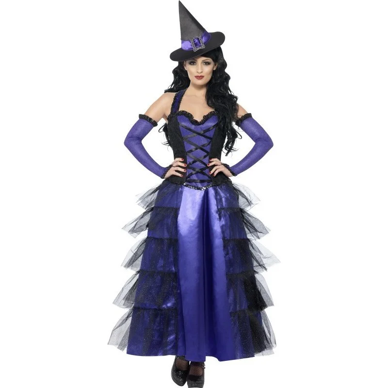 Costume da glamourissima strega viola per la sera di Halloween.